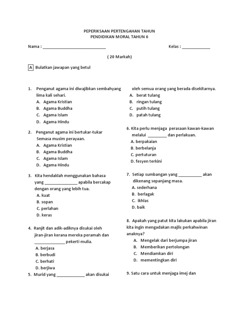 Ujian Pertengahan Tahun Pendidikan Moral Tahun 6 Pdf